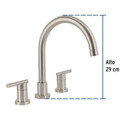 Proveedor:FosetMezcladora p/lavabo,taladros separados,redondos,satín,Tubig, 46760Cuerpo de latón para máxima duración Manerales metálicos tipo volante Cuello de acero inoxidable Cartucho cerámico de suave y fácil...