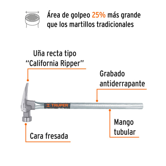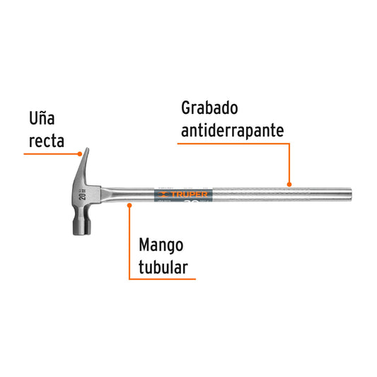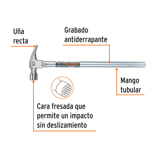 Proveedor:TruperMartillo tubular para cimbra 16 oz uña recta, mango acero Caja con 2, 10754Cabeza de acero con cara fresada que permite un impacto sin deslizamiento y alojamiento imantado para clavos Mango de acero...