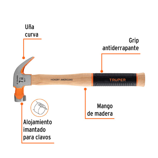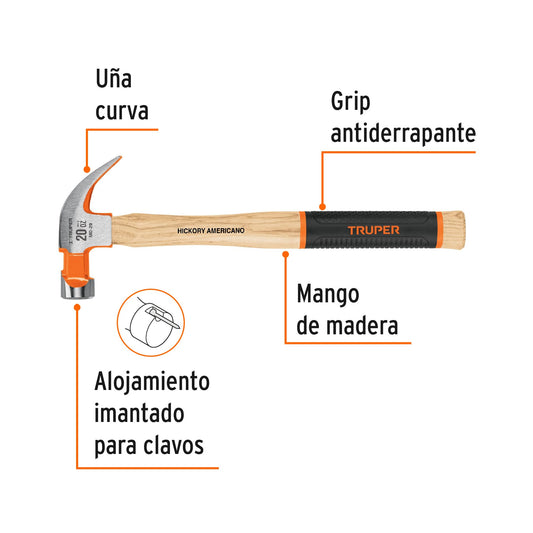 Proveedor:TruperMartillo pulido 20 oz uña curva, mango hickory, Truper Grip Caja con 4, 16656Cabeza de acero con acabado pulido Mango de madera con grip antiderrapante Ideal para clavar o extraer clavos