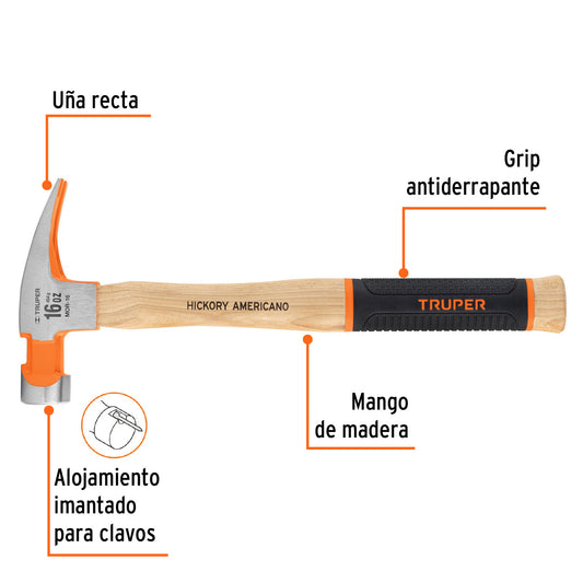 Proveedor:TruperMartillo pulido 16 oz uña recta, mango hickory, Truper Grip Caja con 4, 16658Cabeza de acero con acabado pulido Mango de madera con grip antiderrapante Ideal para clavar o extraer clavos
