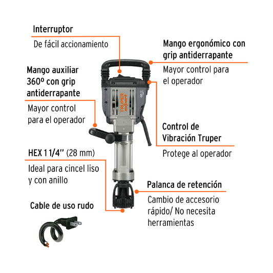 Proveedor:ExpertMartillo demoledor HEX 20 kg, 55J, 1600W, TRUPER EXPERT, 100893