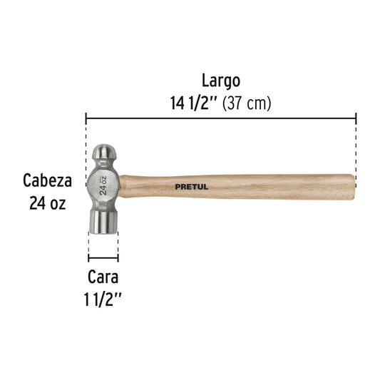 Proveedor:PretulMartillo pulido de bola 24 oz mango madera, Pretul Caja con 4, 22659Cabeza de acero al medio carbono con cara redonda Mango de madera pulido y laqueado