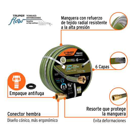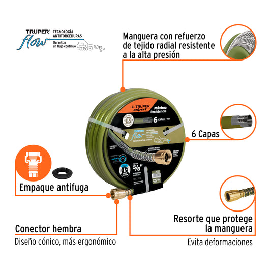 Proveedor:ExpertManguera 5/8' anti-torceduras 6 capas 25m conexiones d/metal, 19702Manguera con refuerzo de tejido radial resistente a la alta presión Conexiones robustas metálicas de máxima durabilidad con resorte que protege...