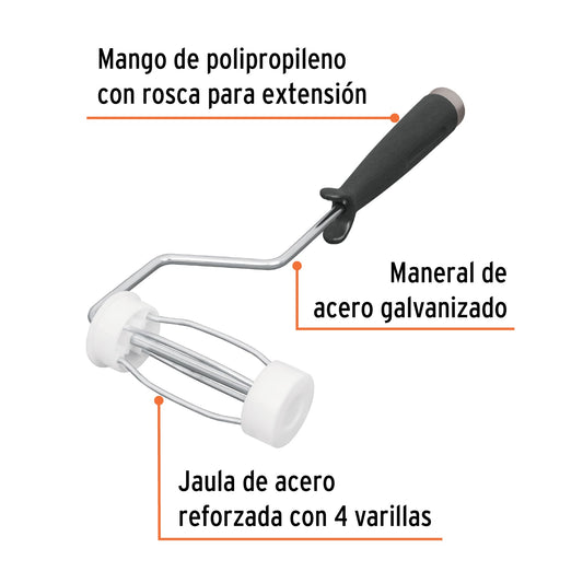 Proveedor:TruperManeral de 4' con jaula para rodillo, Truper Caja con 6, 10743Jaula de acero reforzada con 4 varillas Maneral de acero galvanizado Mango ergonómico y antiderrapante fabricado en polipropileno con rosca...