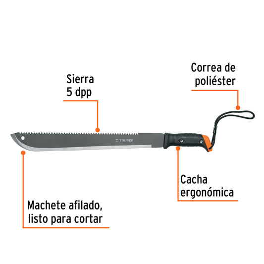 Proveedor:TruperMachete doble filo 18', cacha atornillada, funda de cartón Caja con 3, 158932 herramientas en 1, machete y serrucho Hoja de acero templado para mayor dureza Cacha comfort grip con correa de...