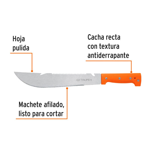 Proveedor:TruperMachete estándar 14' cacha naranja remachada, Truper Caja con 4, 15883Cacha ergonómica con textura antiderrapante para máximo agarre Cacha recta con remaches sólidos para mayor seguridad