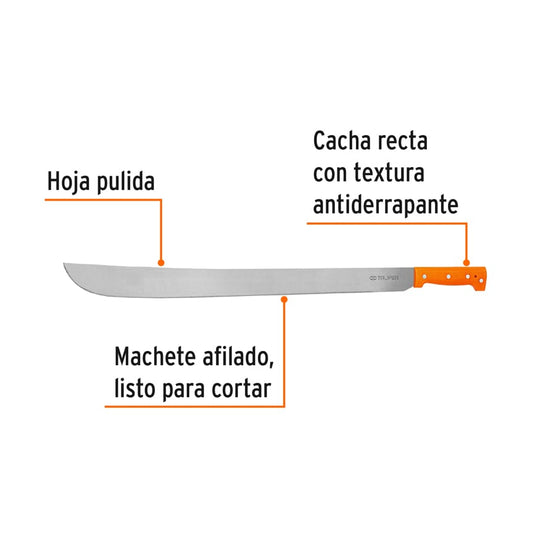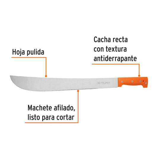 Proveedor:TruperMachete acapulqueño de 24' cacha naranja, Truper Caja con 4, 15881Cacha ergonómica con textura antiderrapante para máximo agarre Cacha recta con tope y remaches sólidos para mayor seguridad