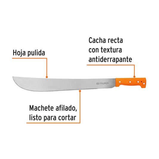 Proveedor:TruperMachete estándar 20' cacha naranja remachada, Truper Caja con 4, 15886Cacha ergonómica con textura antiderrapante para máximo agarre Cacha recta con remaches sólidos para mayor seguridad