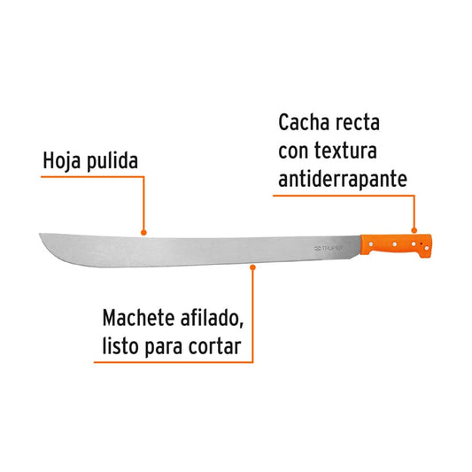Proveedor:TruperMachete acapulqueño de 27' cacha naranja, Truper Caja con 4, 15882Cacha ergonómica con textura antiderrapante para máximo agarre Cacha recta con tope y remaches sólidos para mayor seguridad