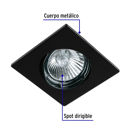 Proveedor:VolteckLuminario cuadrado negro spot dirigible, lámpara no incluida Caja con 4, 45564Cuerpo metálico Compatible con lámpara LED o halógena *Para lámpara de 12 V se requiere transformador de bajo voltaje (no...