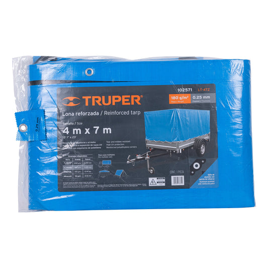 Proveedor:TruperLona reforzada, 4 x 7 m, azul, 102571Fabricadas en polietileno Bordes de 5 cm con sellado térmico Refuerzo de rafia en toda la orilla Para instalación permanente...