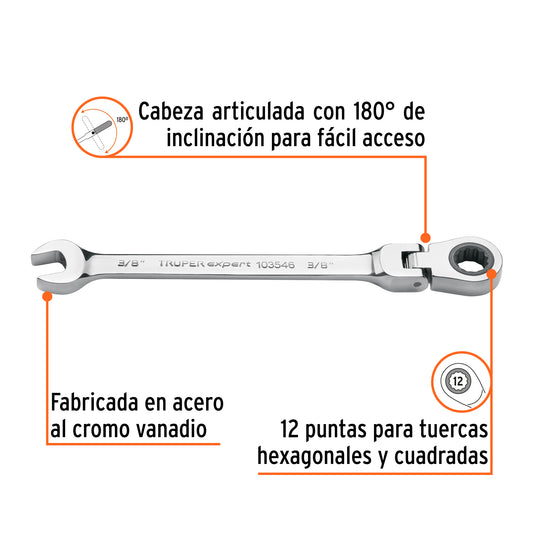 Proveedor:ExpertLlave combinada con matraca 3/8' flexible, Expert Caja con 3, 103546Fabricada en acero al cromo vanadio, 2X más resistentes al desgaste que las de acero al carbono Mecanismo con 90 dientes...