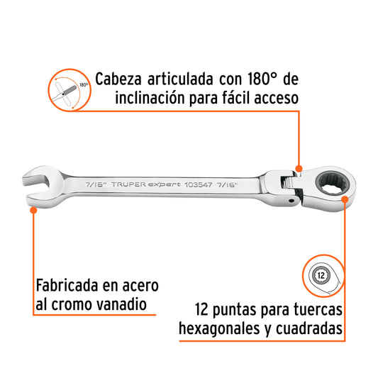 Proveedor:ExpertLlave combinada con matraca 7/16' flexible, Expert Caja con 3, 103547Fabricada en acero al cromo vanadio, 2X más resistentes al desgaste que las de acero al carbono Mecanismo con 90 dientes...