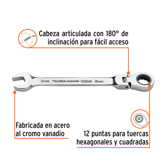 Proveedor:ExpertLlave combinada con matraca 16 mm flexible, Expert Caja con 3, 103540Fabricada en acero al cromo vanadio, 2X más resistentes al desgaste que las de acero al carbono Mecanismo con 90...