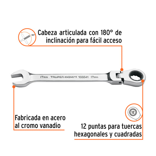 Proveedor:ExpertLlave combinada con matraca 17 mm flexible, Expert Caja con 3, 103541Fabricada en acero al cromo vanadio, 2X más resistentes al desgaste que las de acero al carbono Mecanismo con 90...