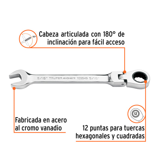 Proveedor:ExpertLlave combinada con matraca 9/16' flexible, Expert Caja con 3, 103549Fabricada en acero al cromo vanadio, 2X más resistentes al desgaste que las de acero al carbono Mecanismo con 90...