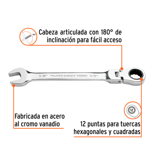 Proveedor:ExpertLlave combinada con matraca 5/8' flexible, Expert Caja con 3, 103550Fabricada en acero al cromo vanadio, 2X más resistentes al desgaste que las de acero al carbono Mecanismo con 90...