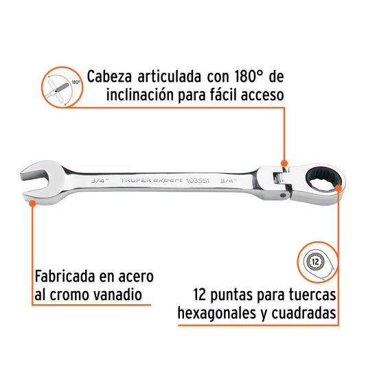 Proveedor:ExpertLlave combinada con matraca 3/4' flexible, Expert Caja con 3, 103551Fabricada en acero al cromo vanadio, 2X más resistente al desgaste que las de acero al carbono Mecanismo con 90 dientes...