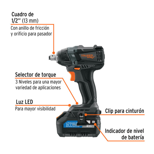 Proveedor:PretulLlave de impacto inalámbrica 1/2', 20V, PRETUL, 28268Impulsor de cuadro 1/2" con pasador retenedor Batería Ion Litio 20 V Indicador de nivel de batería Mango con grip...