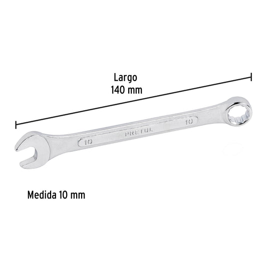 Proveedor:PretulLlave combinada 10 mm x 140 mm de largo, Pretul Caja con 12, 21904Fabricada en acero al cromo vanadio 2X más resistente al desgaste que las de acero al carbono Medida marcada para fácil identificación