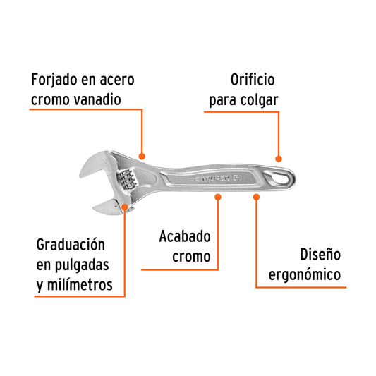 Proveedor:TruperLlave ajustable (perico) 8' cromada mango de PVC, Truper Caja con 6, 15510Forjado en acero al carbono Acabado cromo que protege de la corrosión Graduación en pulgadas y milímetros Mango cubierto de...