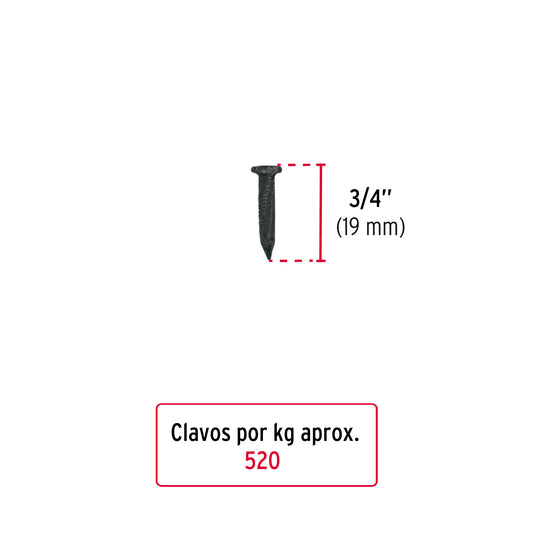 Proveedor:FieroKilo de clavos para concreto 3/4' galvanizado, caja de 25 kg Caja con 25, 44829Fabricados en acero al carbono con tratamiento térmico de templado que brinda mayor resistencia y durabilidad difícil de doblar o...