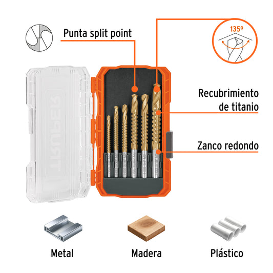 Proveedor:TruperJuego de 6 brocas multimaterial helicoidal con sierra, TRUPE, 103924Fabricadas en acero M2 resistente al desgaste, con recubrimiento de titanio Punta Split Point autocentrable para perfora al primer contacto...