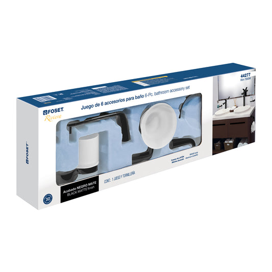 Proveedor:FosetJuego de 6 accesorios para baño, negro, FOSET RIVIERA, 44277Juego de 6 accesorios para baño, negro