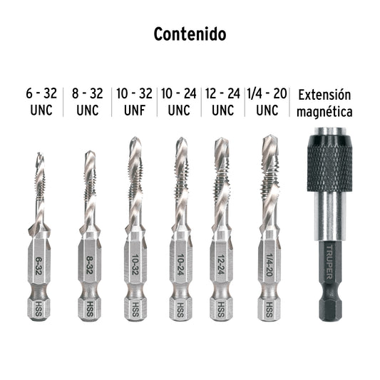 Proveedor:TruperJuego de 6 brocas HSS con machuelo para metal, Truper, 102335