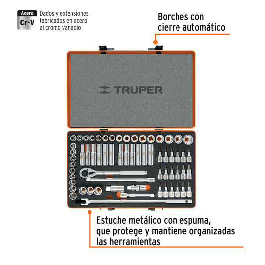 Proveedor:TruperJuego de 64 herramientas cuadro 1/2' std y mm para mecánico, 12892