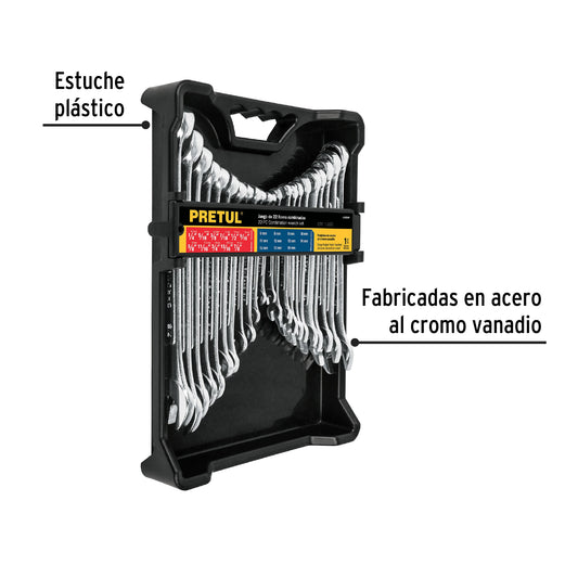 Proveedor:PretulJuego de 22 llaves combinadas std y mm, PRETUL, 22018Fabricadas en acero al cromo vanadio 2X más resistentes al desgaste que las de acero al carbono Medida marcada para fácil identificación...