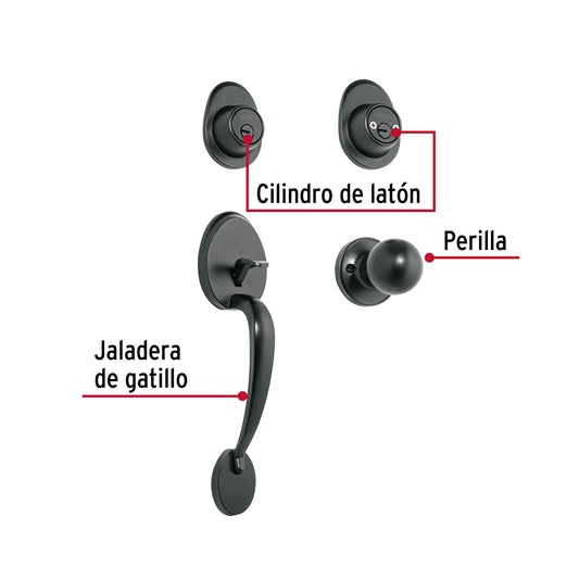 Proveedor:HermexJaladera, perilla y cerrojo llave-llave, negro, 48436Juego de cerraduras jaladera con gatillo y perilla Cerrojos con llave al exterior y al interior Cilindros de latón para...