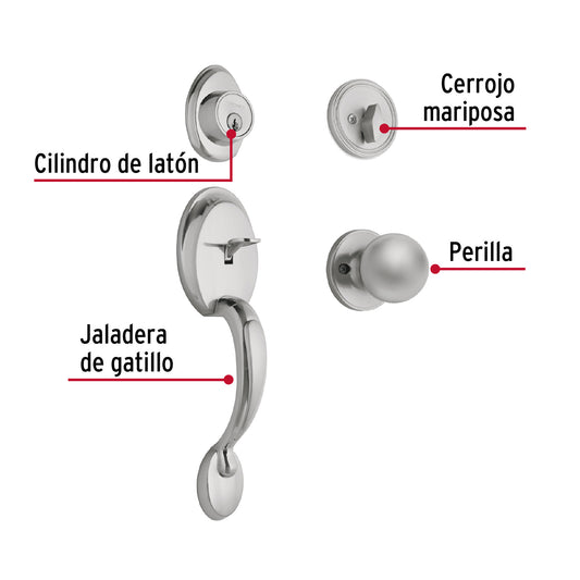 Proveedor:HermexJaladera, perilla y cerrojo mariposa, cromo mate, Basic, 23675Juego de cerraduras jaladera con gatillo y perilla Cerrojos con llave al exterior y mariposa al interior Cilindros de latón...