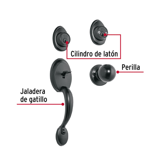 Proveedor:HermexJaladera, perilla y cerrojo llave-llave, negro, Basic, 27238Juego de cerraduras jaladera con gatillo y perilla Cerrojos con llave al exterior y al interior Cilindros de latón para...