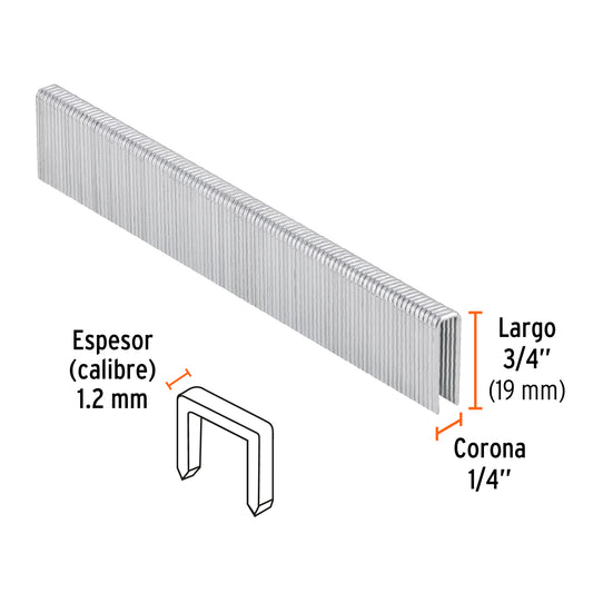 Proveedor:Trupergrapas corona 1/4' calibre 18, 19mm p/ENNE-120 Caja con 5000, 18272Fabricadas en acero Espesor de 1.2 mm Corona de 1/4" Para engrapadora modelo ENNE-120 marca Truper® Compatibles con otras marcas del mercado