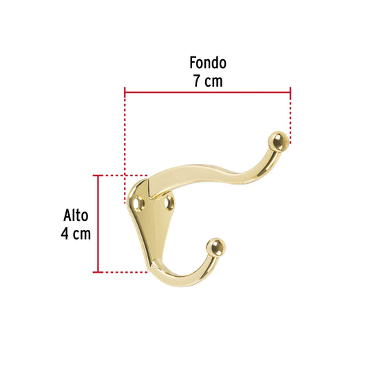Proveedor:HermexGancho doble largo y corto tipo perchero, chico, latón Caja con 12, 46358Metálico con acabado latón brillante Ideal para sombrero y abrigo Uso en armarios, pasillos y baños