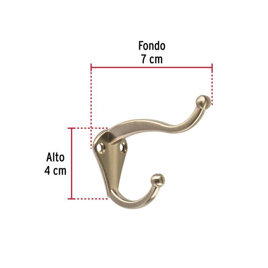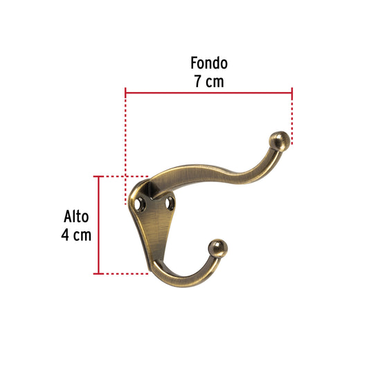 Proveedor:HermexGancho doble largo y corto tipo perchero, chico, antiguo Caja con 12, 46405Metálico con acabado latón antiguo Ideal para sombrero y abrigo Uso en armarios, pasillos y baños