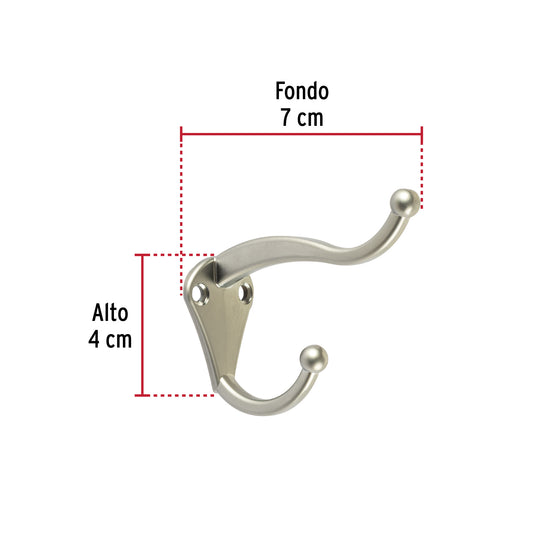 Proveedor:HermexGancho doble largo y corto tipo perchero, chico, niquel Caja con 12, 46367Metálico con acabado níquel satinado Ideal para sombrero y abrigo Uso en armarios, pasillos y baños