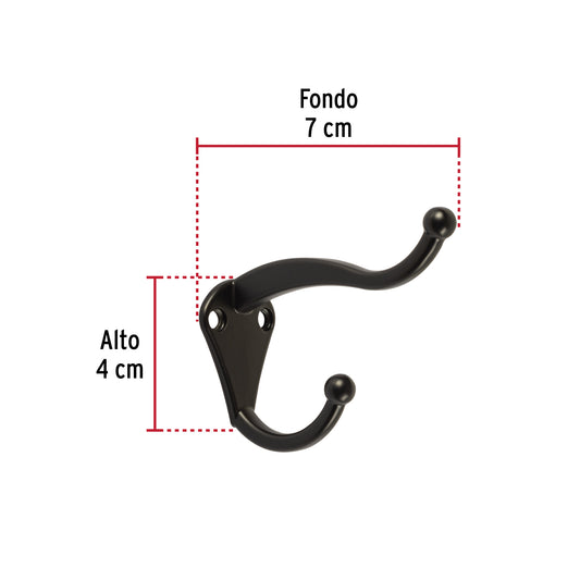 Proveedor:HermexGancho doble largo y corto tipo perchero, chico, negro Caja con 12, 46549Metálico con acabado negro Ideal para sombrero y abrigo Uso en armarios, pasillos y baños