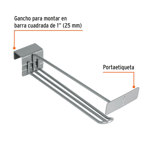 Proveedor:TruperGancho recto reforzado de 10' con portaetiqueta, Truper Caja con 24, 10259Para productos pesados Ideal para góndola Gancho para montar en barra cuadrada de 1" (25 mm)