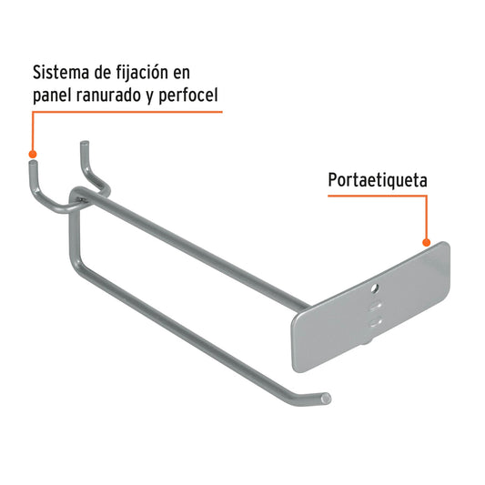 Proveedor:TruperGancho recto 4' con portaetiqueta para perfocel y ranurado Caja con 24, 50150Fabricado en acero Sistema de fijación en panel ranurado y perfocel Portaetiqueta para precio o identificación del contenido