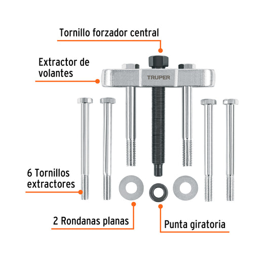Proveedor:TruperExtractor de volantes, 11 piezas, Truper Caja con 3, 14508Cuerpo de acero al carbono Tornillo forzador de acero al cromo Punta giratoria flotante que no daña el eje Ideal...