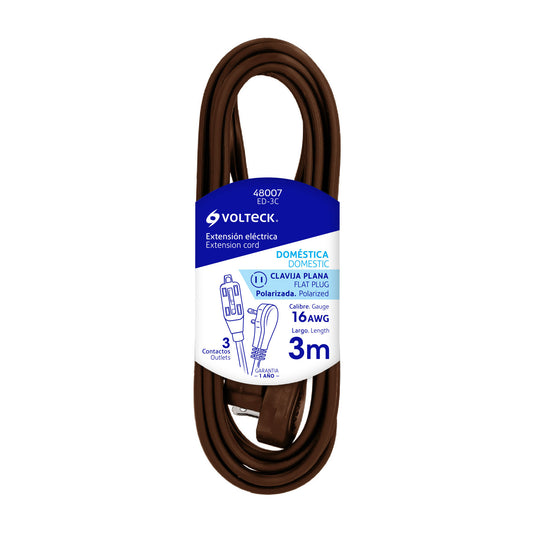 Proveedor:VolteckExtensión eléctrica doméstica 3 m clavija plana, café Caja con 6, 48007Recubierta de PVC resistente a la propagación de la flama 3 Contactos polarizados Su diseño permite conectar clavijas aterrizadas Clavija...