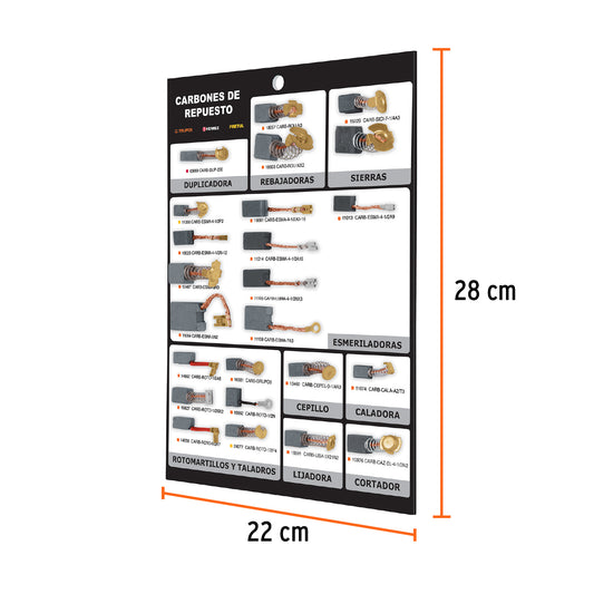Proveedor:TruperExhibidor Truper de carbones de repuesto, 55566Exhibidor dividido por familia de producto Producto asegurado sobre hojas de PVC rígido impreso Incluye producto real en todas las medidas...