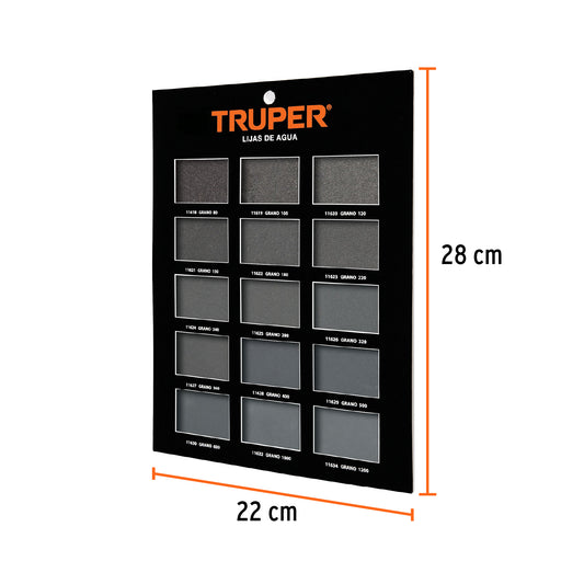 Proveedor:TruperExhibidor Truper de lijas de agua, 55559Exhibidor dividido por familia de producto Producto asegurado sobre hojas de PVC rígido impreso Incluye producto real en todas las medidas...