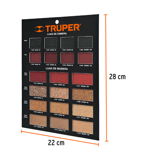 Proveedor:TruperExhibidor Truper de lijas de madera, 55560Exhibidor dividido por familia de producto Producto asegurado sobre hojas de PVC rígido impreso Incluye producto real en todas las medidas...