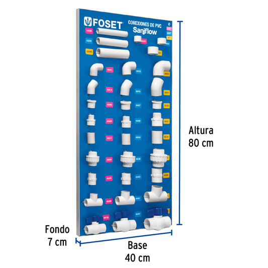 Proveedor:FosetExhibidor de conexiones de PVC hidráulico, cédula 40, 55943Tablero fabricado con MDF con cubrecantos de PVC blanco Para exhibir el producto aprovechando al máximo los espacios Incluye accesorios...