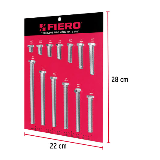 Proveedor:FieroExhibidor Fiero con tornillos tipo máquina, 5/16', 55897Producto montado sobre hoja de PVC rígido espumado y asegurado con alambre galvanizado Con orificio para colgarse Incluye producto real...