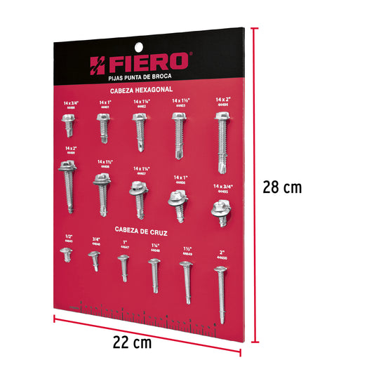 Proveedor:FieroExhibidor Fiero de pijas punta de broca, 55549Producto montado sobre hoja de PVC rígido espumado y asegurado con alambre galvanizado Con orificio para colgarse Incluye producto real...