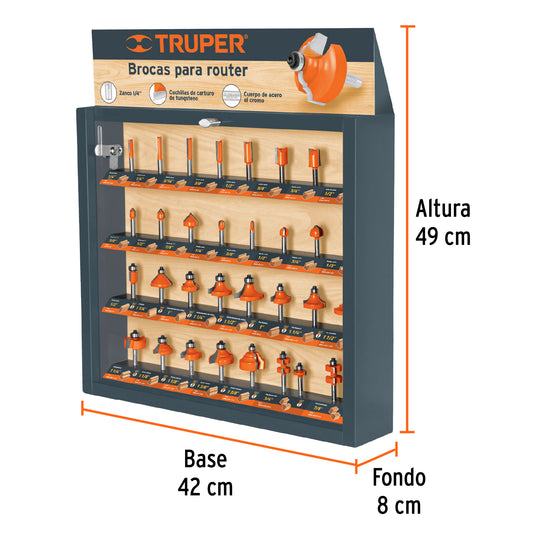 Proveedor:TruperExhibidor con 30 brocas para router, Truper, 55218Fabricado en MDF Puntas de carburo de tugsteno Modelos con guía de balero que facilita el corte